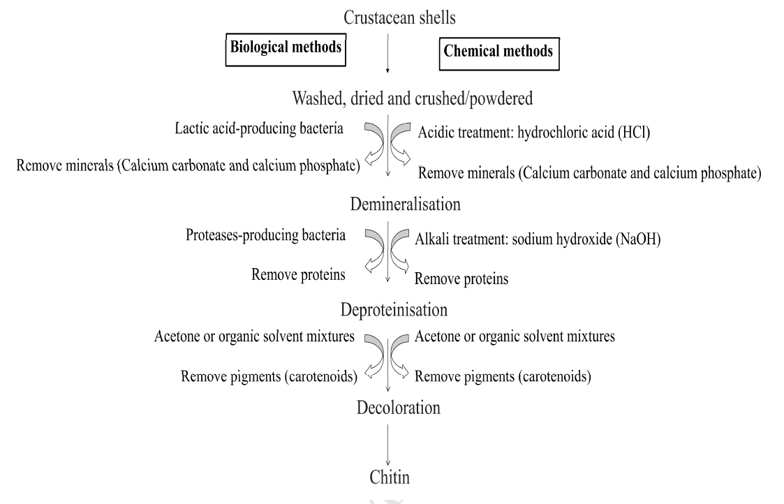 There are two types of methods are used to obtain chitin: chemical and biological (microbial) methods (Figure 2). The chemical methods are the most commonly used treatment commercially, although it has several defects such as: uneconomical, eco-unfriendly, and negatively, those affect the physico-chemical properties of chitin. Another drawback of chemical chitin purification is that the removed proteins and minerals, although potentially valuable supplements for human foods and animal feeds, are sufficiently damaged that they are no longer appropriate for these applications (Arbia et al., 2013; Hamed et al., 2016). Therefore, the interest in biological extraction is increasing since it is a safer and cheaper treatment for chitin recovery. But till now, it has been limited to laboratory scale studies (Kaur & Dhillon, 2013).