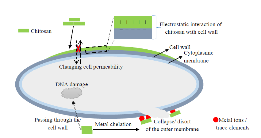 Chitosan also acts as a chelating agent that selectively binds trace metals and thereby inhibits the production of toxins and microbial growth (Cuero et al., 1991; Li et al., 2010; Chien et al., 2016; Yuan et al., 2016). It also activates several defense processes in the host tissue (El Ghaouth et al., 1992), acts as a water binding agent and inhibits various enzymes (Young et al., 1982). Binding of chitosan with DNA and inhibition of mRNA synthesis occurs via chitosan penetrating the nuclei of the micro-organisms and interfering with the synthesis of mRNA and proteins (Sudharshan et al., 1992; Devlieghere et al., 2004; Chen et al., 2005; El-tahlawy et al., 2005). Chitosan on the surface of the cell can form a polymer membrane which prevents nutrients from entering the cell (Zheng et al.,2000; Helander et al.,2001; Liu et al.,2004) or acts as an oxygen barrier which can inhibit the growth of aerobic bacteria (Yuan et al., 2016). Chitosan generally has antimicrobial activity against both Gram-positive and Gram-negative bacteria as well as fungi, while it has stronger bactericidal effects against bacteria rather than against fungi (Ziani et al., 2009; Kong et al., 2010).