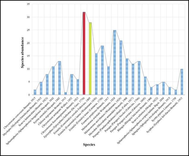 Relationship between the species richness of family Syrphidae (Insecta: Diptera) with large scale environmental variables and latitudinal gradient have been widely studied over two years (2015-16) in the selected study area of the state of Himachal Pradesh. Overall 854 examples of hover flies were collected during our study period. Altogether 34 species under 16 genera have been identified from the selected study areas along an altitudinal slope (Figure 1B). Episyrphus (Episyrphus) balteatus (De Geer, 1776) found to be the most prevalent syrphid along the whole elevation span while Eristalis (Eoseristalis) cerealis Fabricius, 1805 the most abundant among the whole species group.