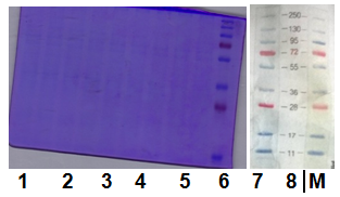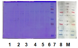 Fig.2 shows that there was a consistent protein expression from Madura Moringa oleifera leaves. The proteins were expressed as blue band in Lane 1 to 8 with 36 kDa molecular weight. The protein bands were uniform, which means there were no difference in terms of density between the shoot and real leaves extract.